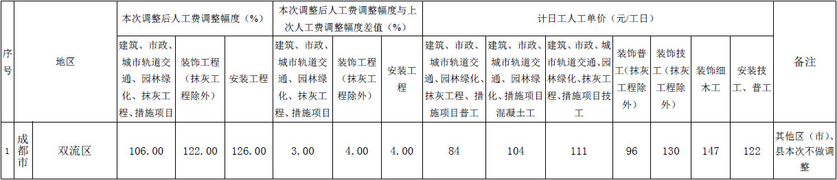 关于2015年《四川省建设工程工程量清单计价定额》人工费调整的请示收悉。根据2015年《四川省建设工程工程量清单计价定额》(川建造价发[2014]439号)和《关于印发2015年〈四川省建设工程工程量清单计价定额〉人工费调整系数公式和〈2015年〈四川省建设工程工程量清单计价定额〉人工费调整幅度及计日工人工单价〉表格的通知》(川建价发[2014]33号)的要求,现批准成都市等1